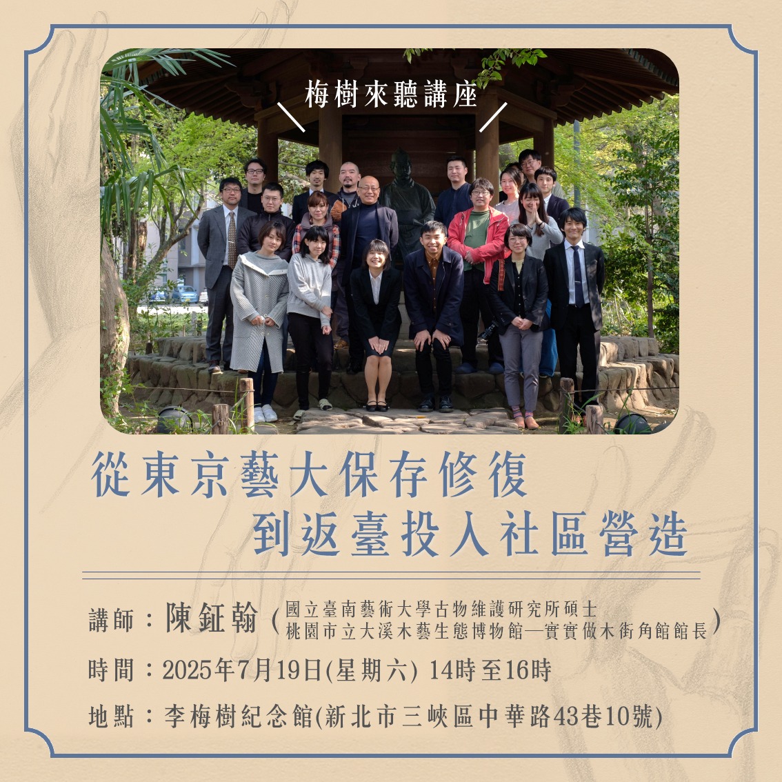 此外,熱心公益的李梅樹教授,於 1935 至 1958 年間,陸續以三峽街庄協議員,縣議員等身分服務鄉里。日後並於藝專 (現國立台灣藝術學院)、文化、師大等校任教。終其一生,李氏身兼藝術家,教育家,政治家與廟宇建築家,81 年多采多姿的藝術生涯,在台灣美術史上寫下燦爛傳奇的一頁。