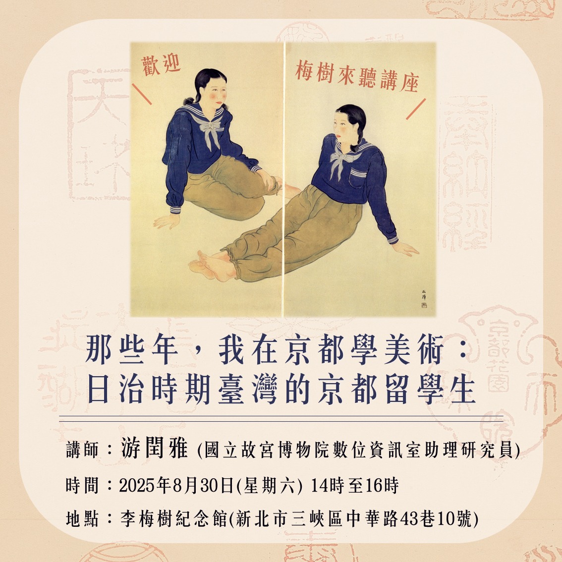 李梅樹(1902~1983)早年就讀總督府國語學校師範部,深受西洋繪畫的薰染,習畫的意念油然興起。早期畫作 1927《靜物》;1928《三峽的町裡》先後入選第一、二屆臺展。1928 年赴東京,奔波習畫於川端、同舟社及本鄉三個繪畫研究所。翌年,通過東京美術學校(東京藝大前身)入學試,師事畫壇大師長原孝太郎、小林萬吾及岡田三郎助等,奠定其後寫實風格的深厚基礎。