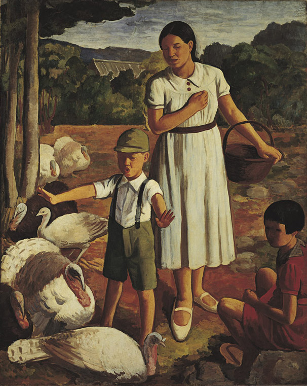 ▲〈戲弄火雞的男孩〉是李梅樹早年繪製的親子畫,畫中角色為李梅樹的妻子林粒(1904-1991)、二女兒麗月,以及正在戲弄火雞的長子景暘。