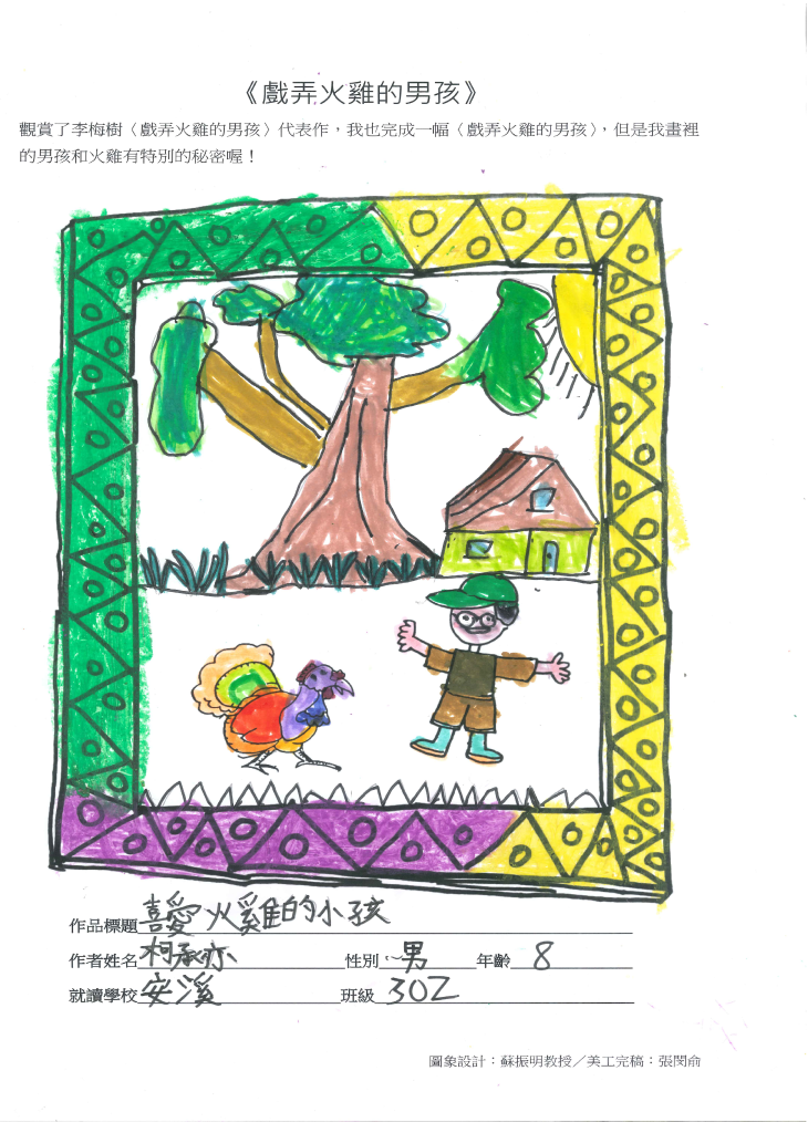 ▲安溪國小兒童畫〈喜愛火雞的小孩〉,與李梅樹風格不同,男孩捨棄原畫中的親子關係,顯示兒童以自我為中心的特性。